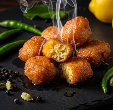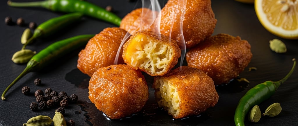 These fritters occupy liminal space—neither dessert nor conventional snack. Serve warm with cooling yogurt sauce, honey-lime drizzle, or fresh mint chutney. The bite-sized format makes them ideal for exploratory tasting, allowing diners to calibrate their relationship with unconventional flavor combinations.